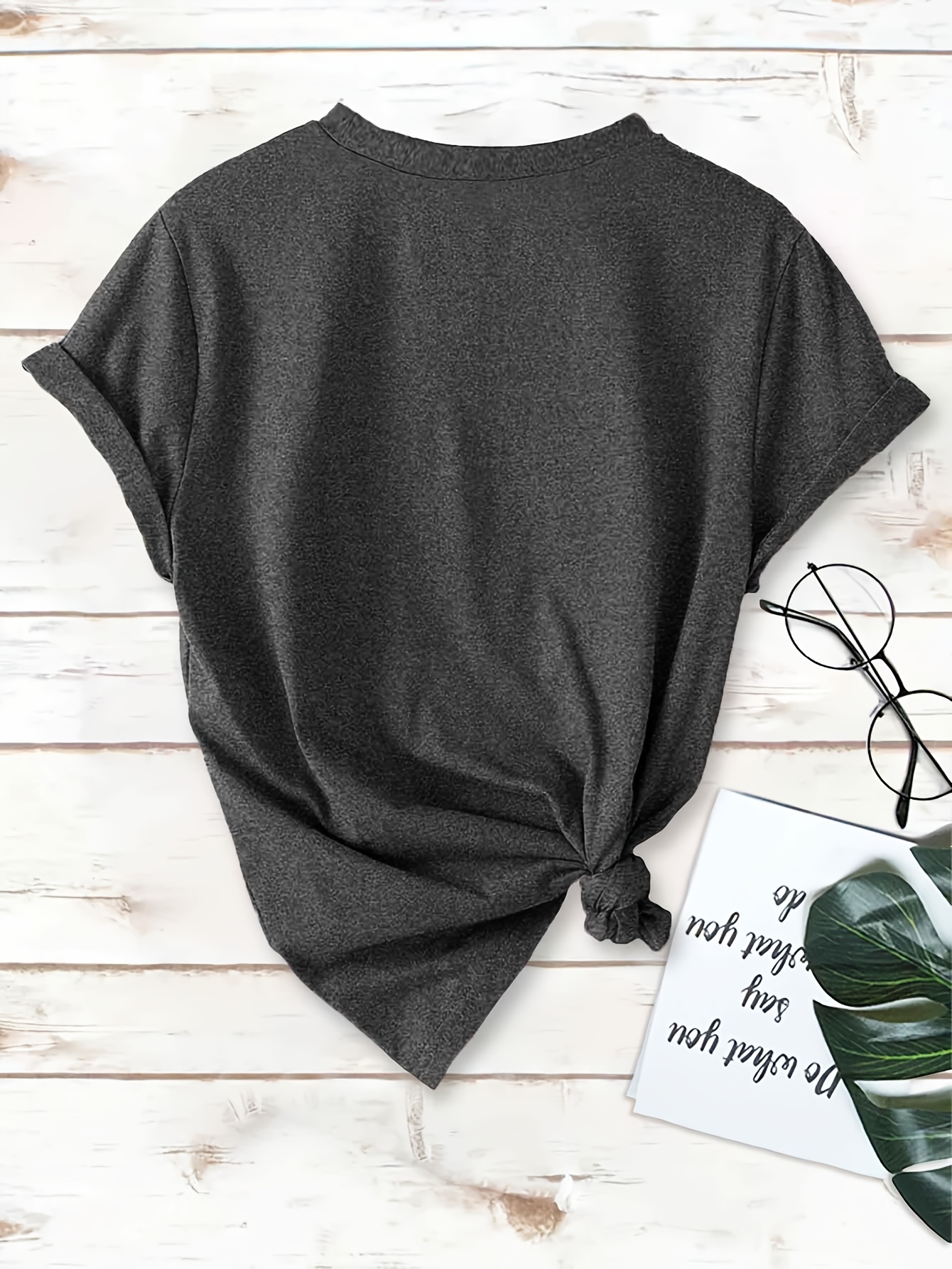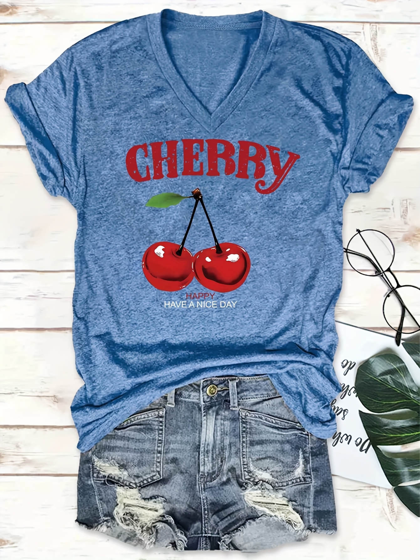 [Cherry Print T-Shirt] Women's Casual Summer V-Neck T-Shirt with Red Cherry Print and Happy Ankle-Day Applique Detail, Short Sleeve Graphic Tee