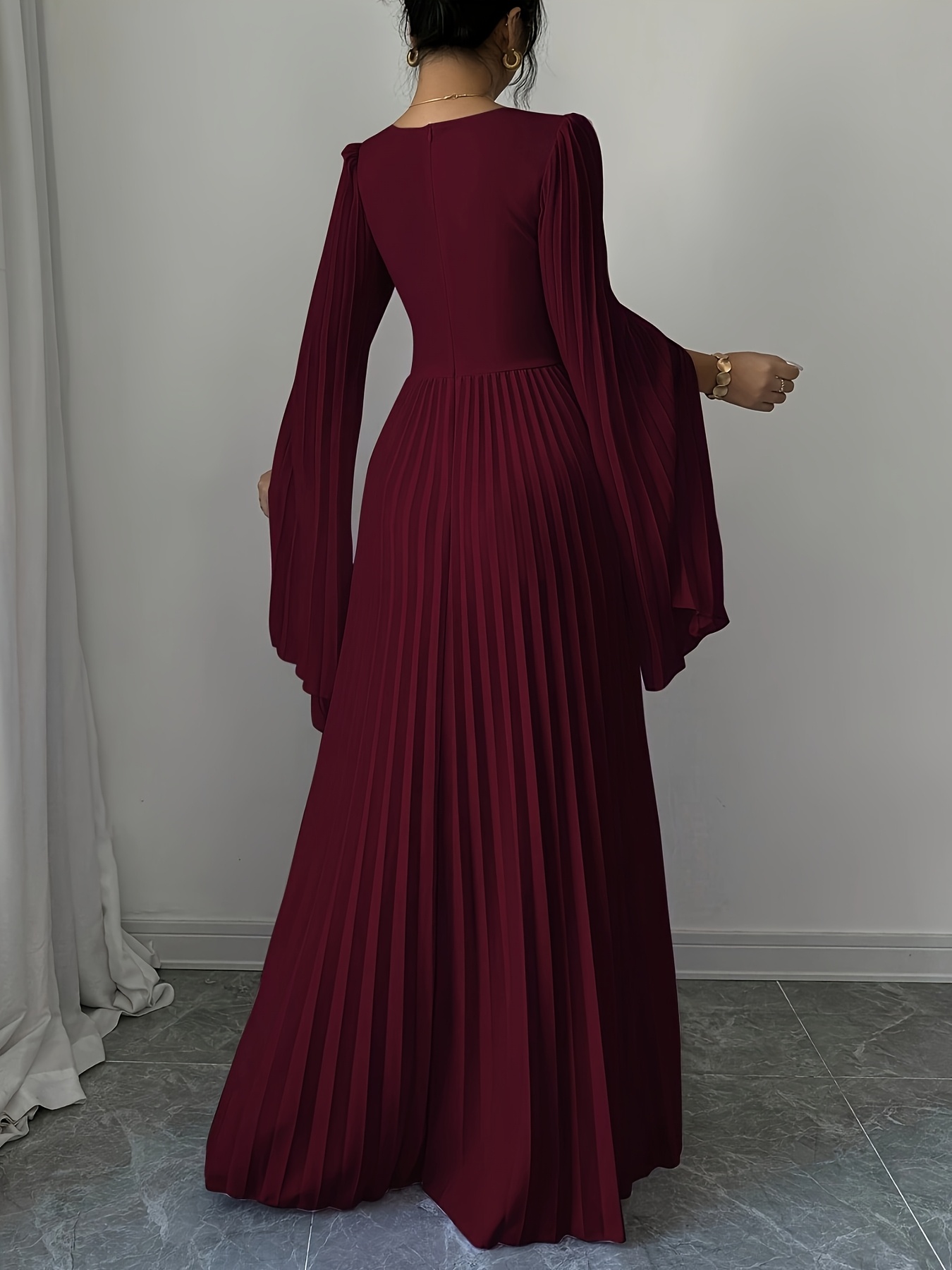 Elegant Long Sleeve V-Neck Pleated Maxi Dress with Side Slit - Maroon, Cinched Waist, Flowing Design for Women, Perfect for Spring & Fall, Cute Dress
