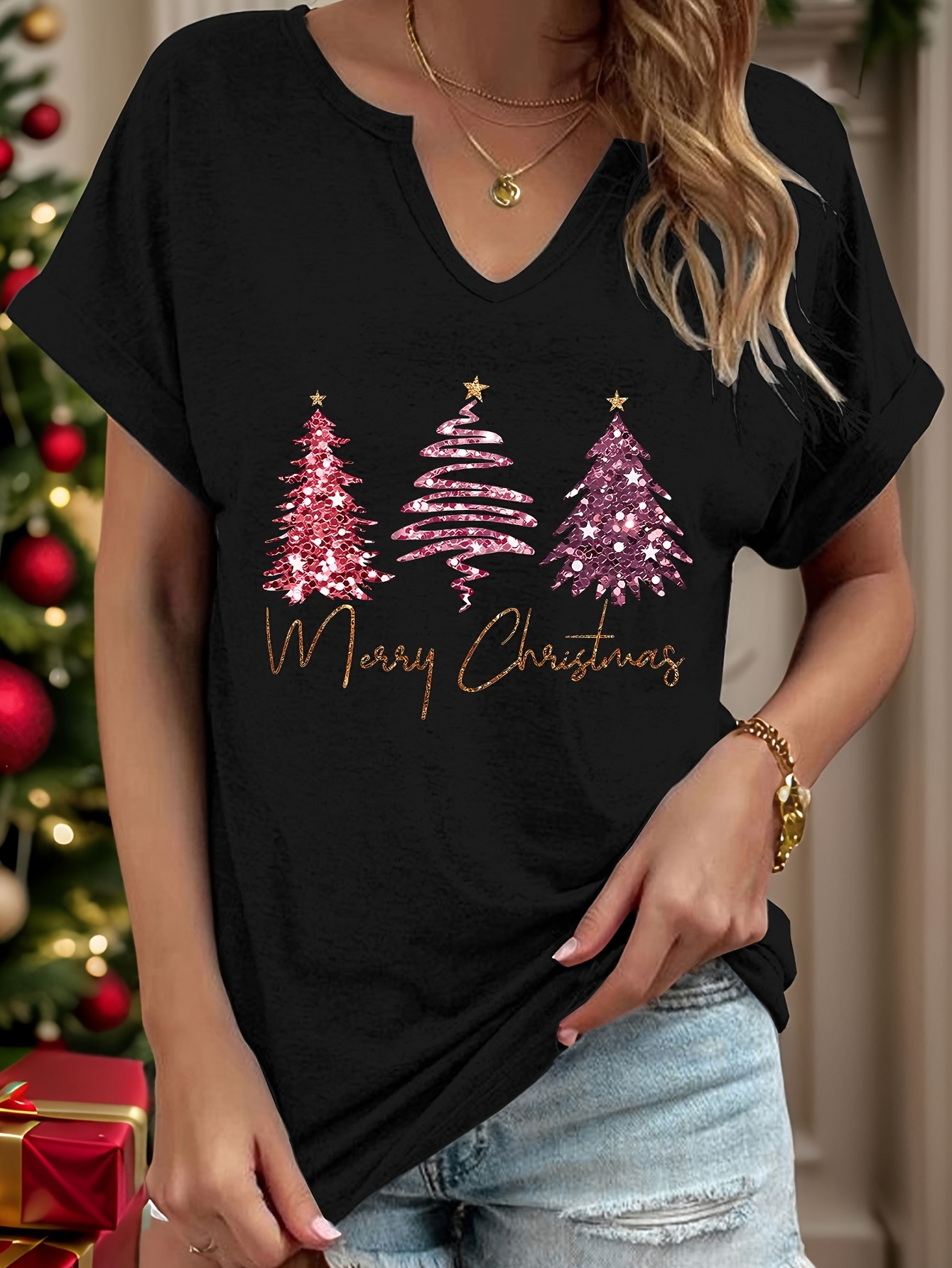 [Festive Christmas Tree Print Tee ] Women'S Christmas Tree Print T-Shirt, Polyester Blend, V-Neck, Short Sleeve, Knit Fabric, Casual Pullover with Slight Stretch, for Festive Holiday Top