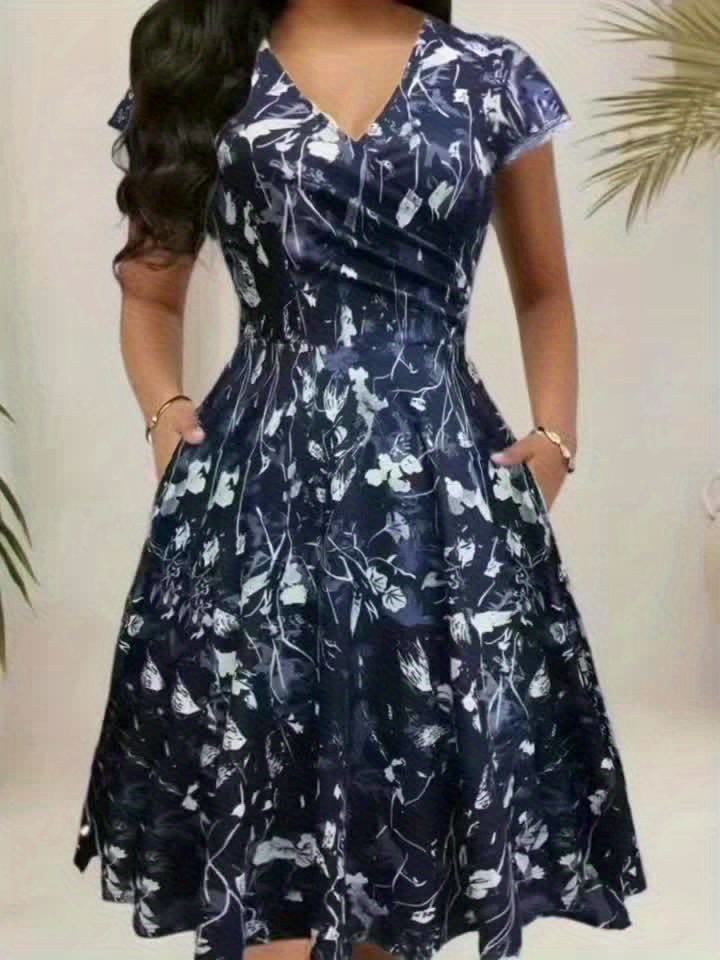 [Navy Blue Floral Dress] Polyester Blend Women's Navy Blue Floral Print V-Neck Midi Dress with Short Sleeves and Pockets | Casual Dress, Floral Print Dress, Perfect for Spring, Summer, and Fall