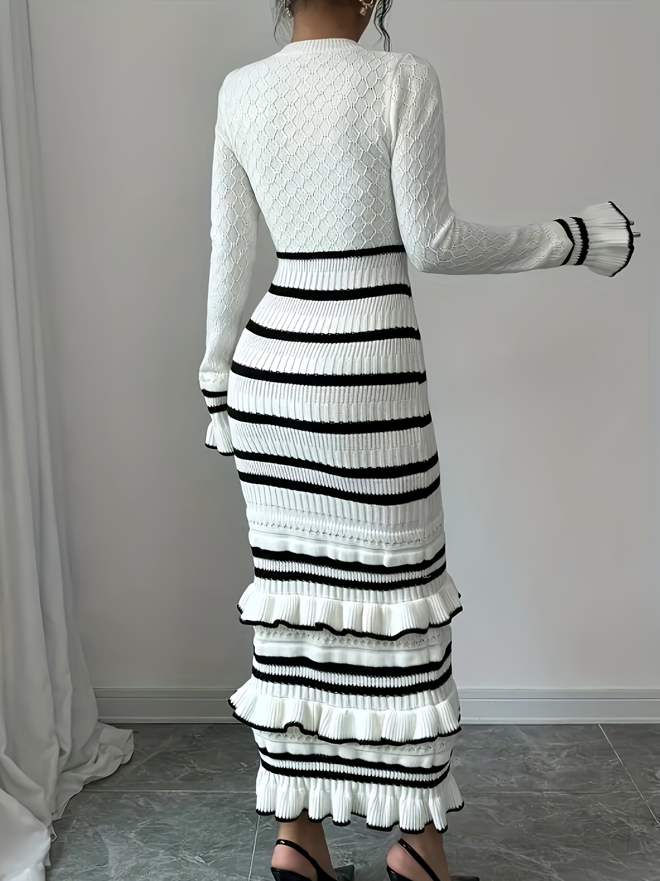 Women's Elegant Striped Dress - Slim Fit Waist-Cinching Bodycon with Ruffled Hem, Black & White Horizontal Stripes, Round Neck Long Sleeve Fall Winter Fashion, Dress
