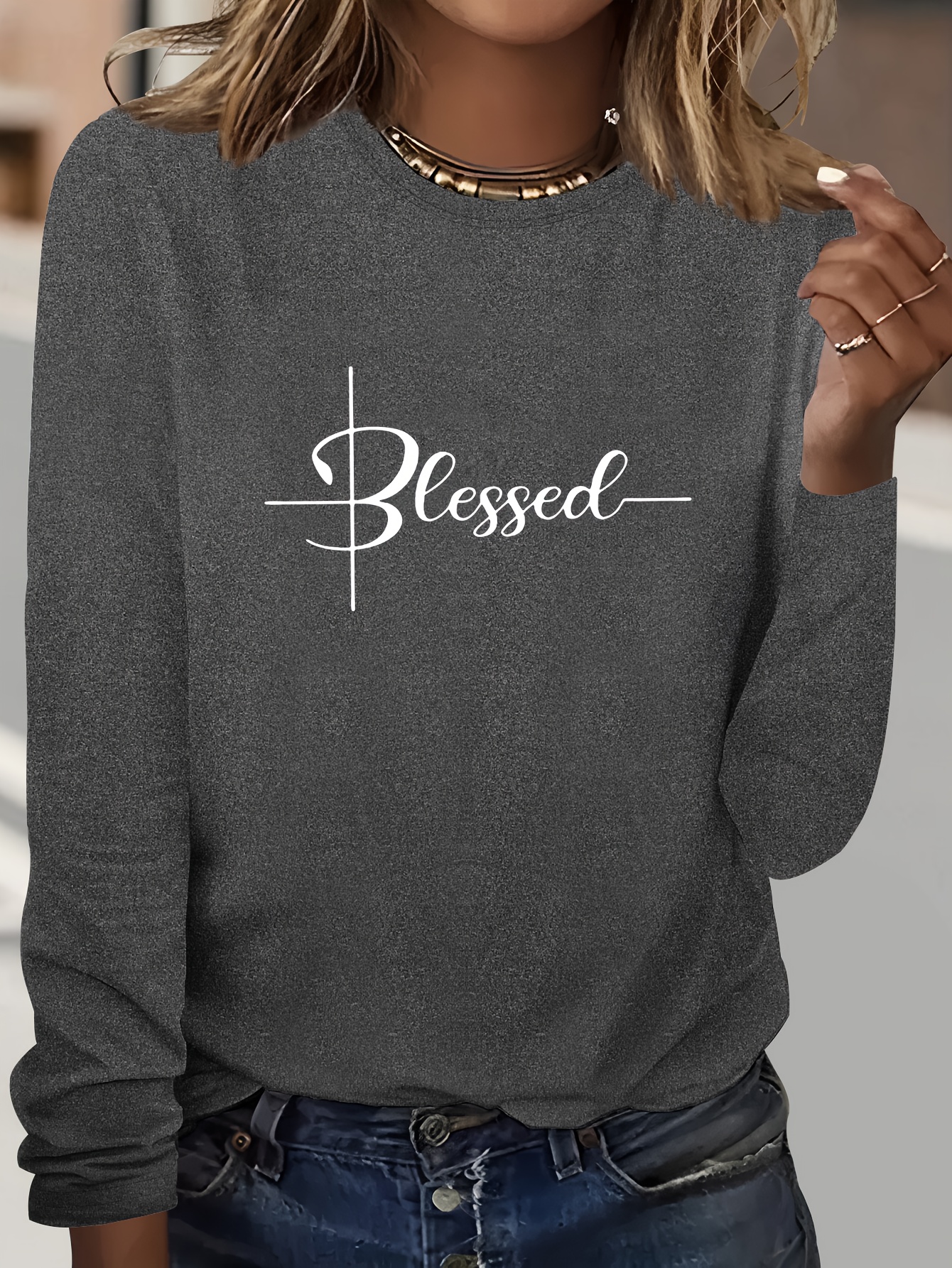 Chic Geometric Print Long Sleeve T-Shirt for Women - Casual Crew Neck, Soft Polyester, Perfect for Fall & Winter