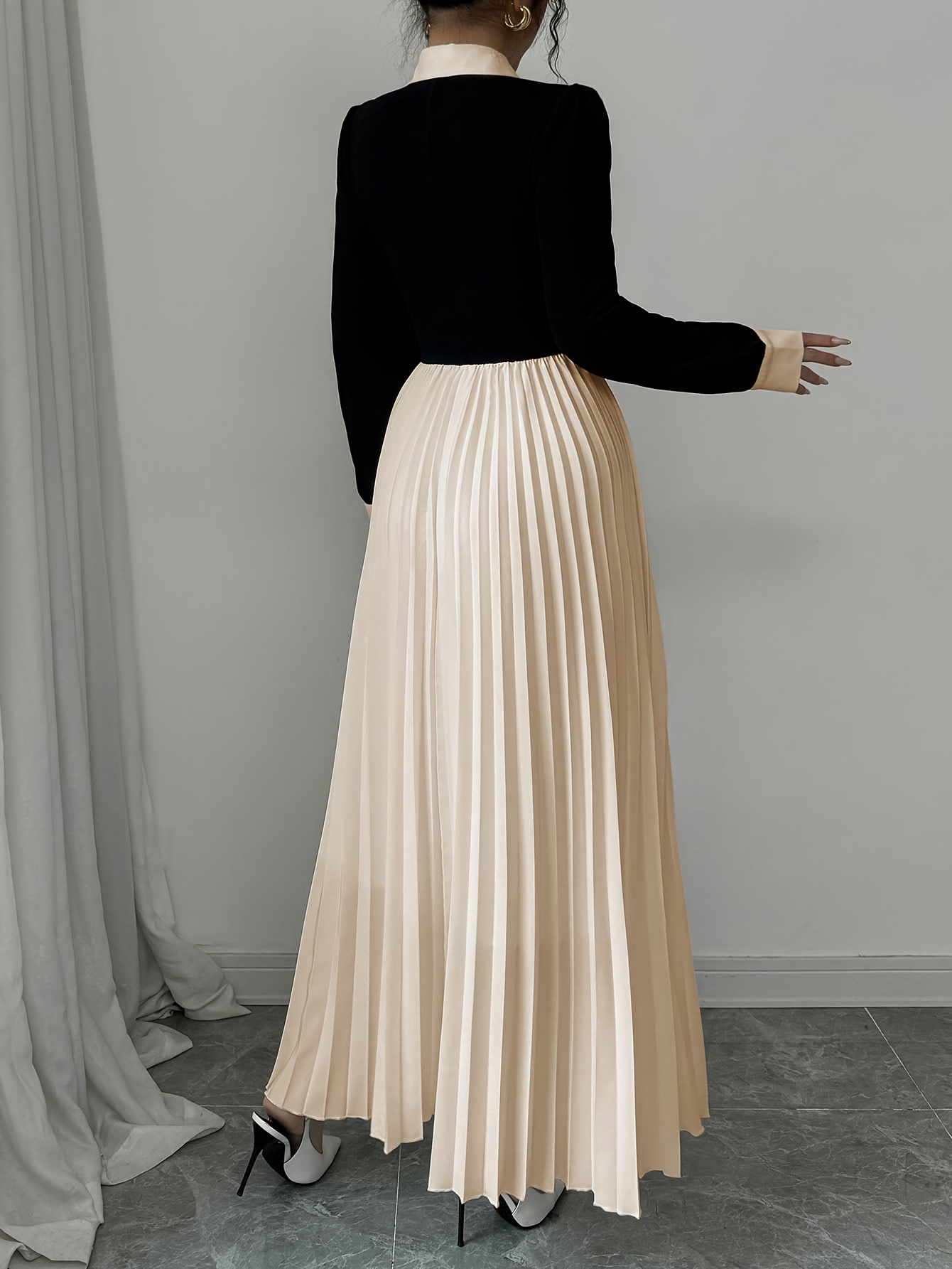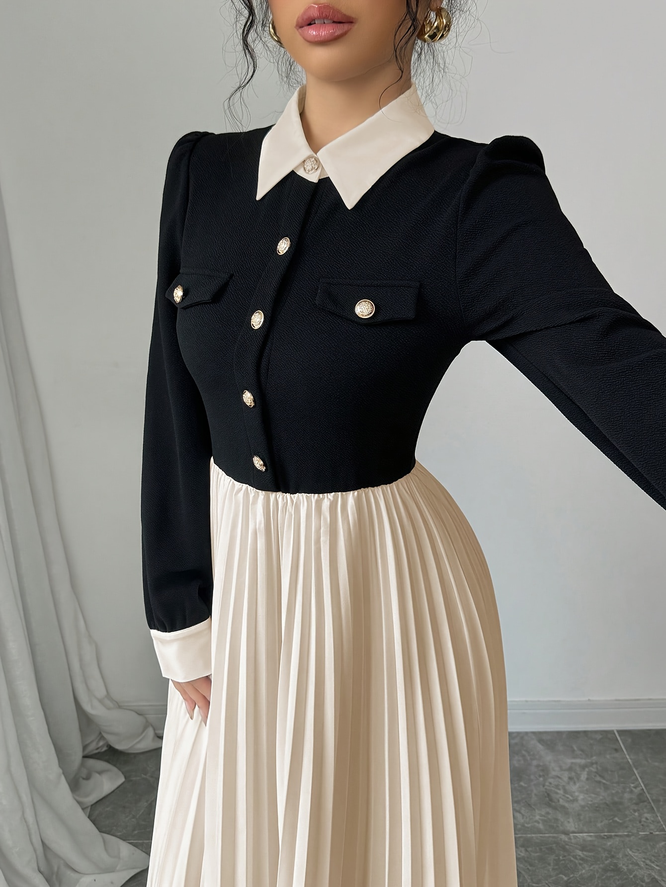 [Elegant Dress for Women] Golden Button Elegant Dress for Women with Contrasting Colors, Cinched Waist, Pleated Design and Long Sleeves, Perfect for Parties, Weddings, Music Festivals and Dates