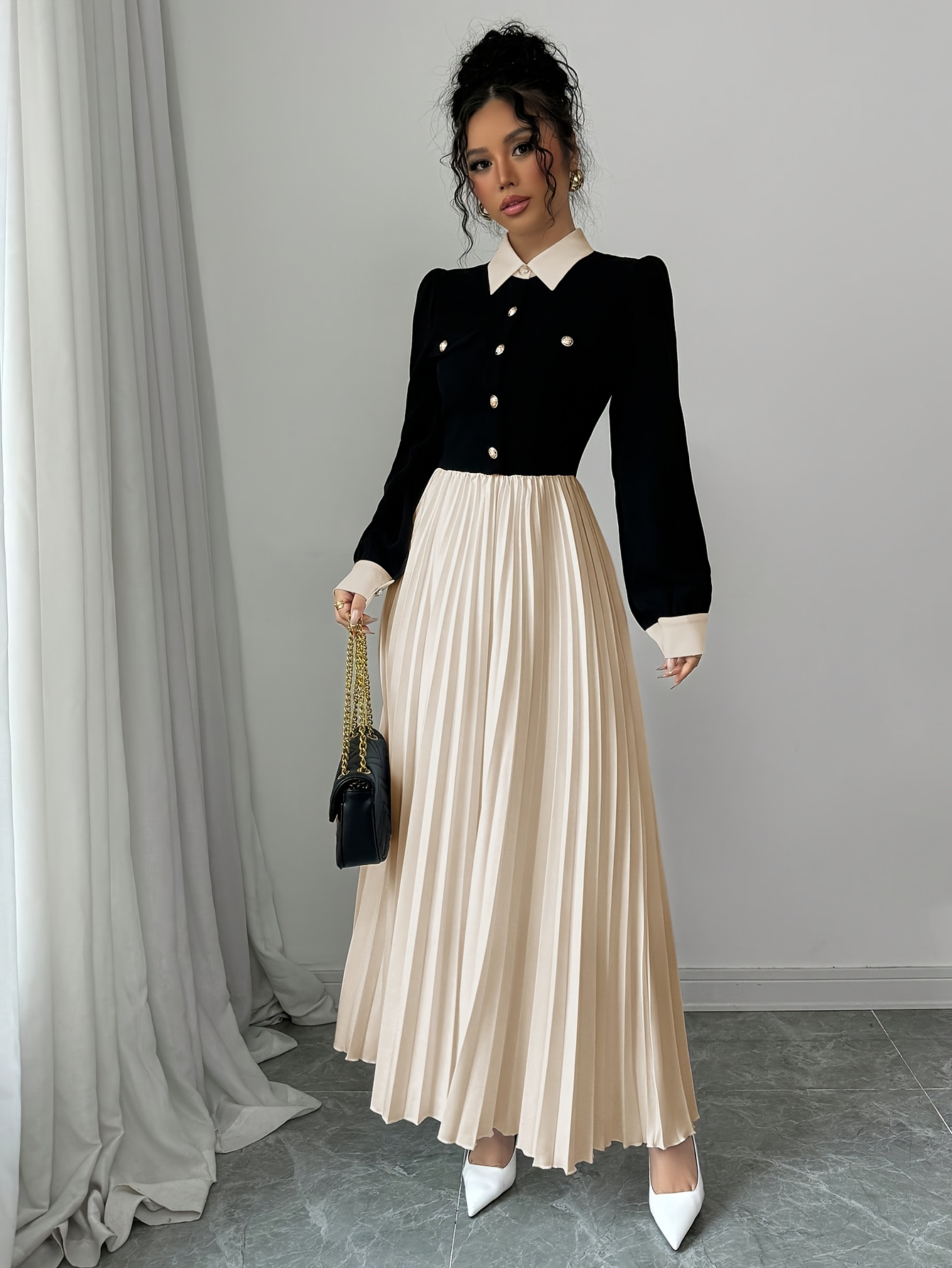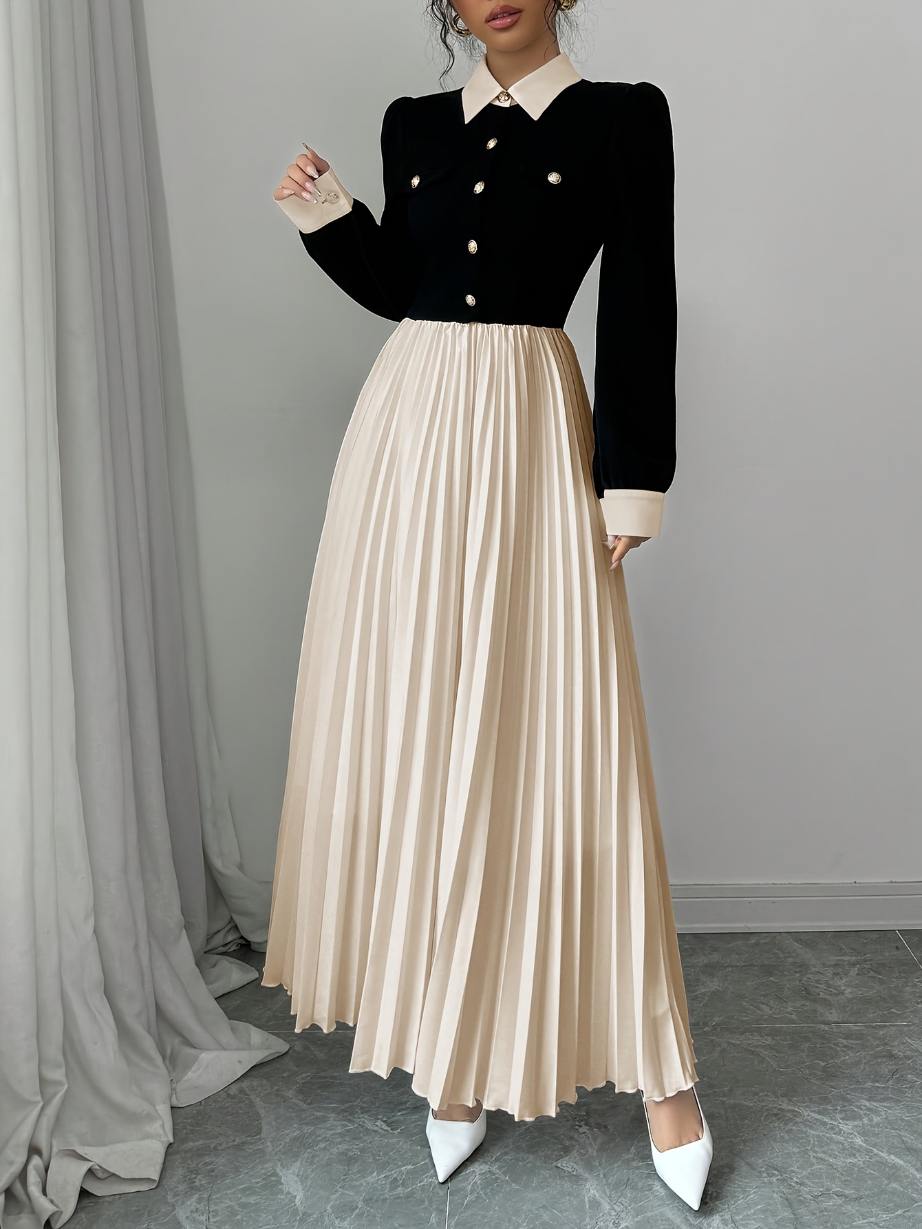 [Elegant Dress for Women] Golden Button Elegant Dress for Women with Contrasting Colors, Cinched Waist, Pleated Design and Long Sleeves, Perfect for Parties, Weddings, Music Festivals and Dates